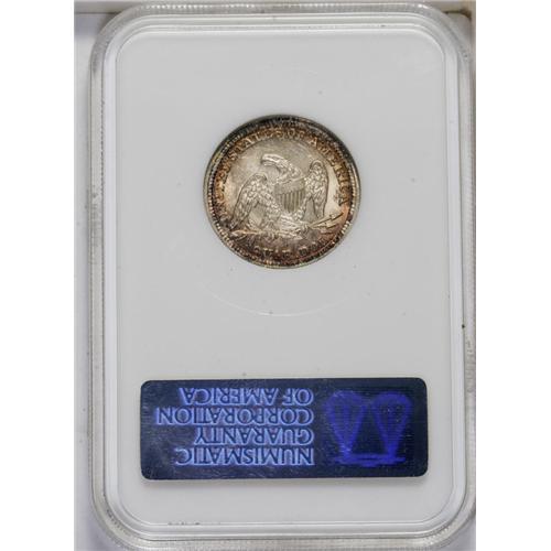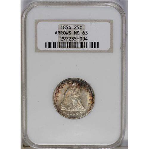 <B>1854<25C> Arrows MS63 NGC.</B></I> Fire-red and navy-blue borders frame untoned centers. Lustrous, clean, and crisply struck. Numerous slender peripheral die breaks should interest the specialist. The left arrowhead is repunched. Housed in an early generation holder.<BR><I>Ex: Set Shahbabian, M.D. Collection (Bowers and Merena, 1/96), lot 1407, which realized $990.</B></I><BR><I>From The Chief Paduke Collection.</B></I>
