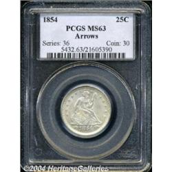 <B>1854<25C> Arrows MS63 PCGS.</B></I> This is an important opportunity for the type collector to obtain a first-year design type, one of just two dates of this variety. Quite sharply struck although a few peripheral details are weak, a result of prominent die flow lines that indicate extensive use. Frosty lustre is subdued slightly by light silvery-gray coloration. <BR><BR><B>Important notice:</B> Heritage usually auctions material at the rate of 200-250 lots per hour. On some occasions eBay Live bid software or the Internet may not be able to keep up with the pace of the auction. We recommend placing a realistic absentee bid now as insurance to avoid disappointment. Occasionally the auctioneer may eliminate or reject an eBay Live bid, and the auctioneer may also reopen a lot after the close of the eBay live bidding (usually because we missed an audience bid), and may reject your bid even if it shows you as the winning bidder. By bidding via eBay Live, you agree that Heritage may award the lot to another bidder at its sole discretion under the circumstances described above or any other reasonable circumstances. Since eBay bids are not shown to us until we open the lot on the floor, we treat those bids just like floor bids. In most cases the floor responds before the eBay bid is presented to us, due to Internet lag time, so for consistency we have made it a policy that floor bids are always considered first over tie eBay live bids. Also please note that all Heritage lots purchased through eBay Live carry a 20% Buyer's Premium. Please make sure you read the Terms and Conditions before you bid. </span></font></tr></table></td></tr></table>