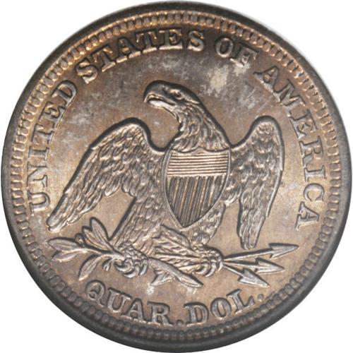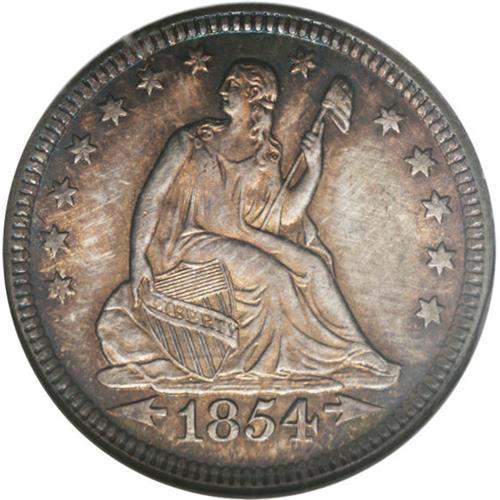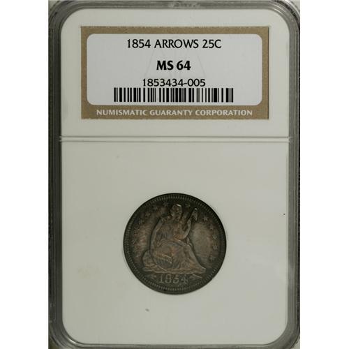 <B>1854 25C Arrows MS64 NGC.</B></I> Apricot-gold, gunmetal-blue, and sea-green toning embraces this satiny and chiefly mark-free near-Gem. Well struck except for the stars. Although more than 12 million pieces were struck, these went into circulation, where they were needed to replace hoarded old tenor silver. An important type coin, struck only in 1854 and 1855.<BR><BR><b>Shipping:</b> Coins & Currency (<a target="_blank" href="http://www.heritageauctions.com/common/shipping.php">view shipping information</a>)