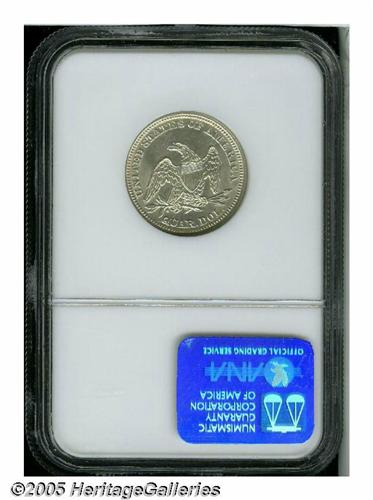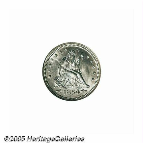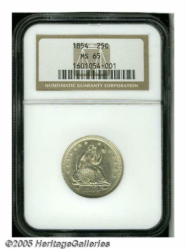 <B>1854<25C> Arrows MS65 NGC.</B></I> A stunning type coin, satiny in appearance and nearly void of toning. Just a couple of minor contact marks are noticed on the obverse, while the reverse borders on perfection. Multiple wispy die cracks (as struck) are evident near the obverse and reverse borders, and the overall striking details seem to be essentially full. A lovely, no-questions Gem. Population: 17 in 65, 6 finer (6/05).