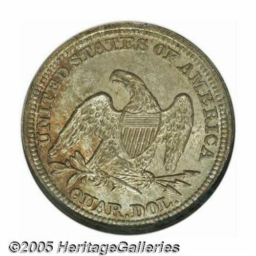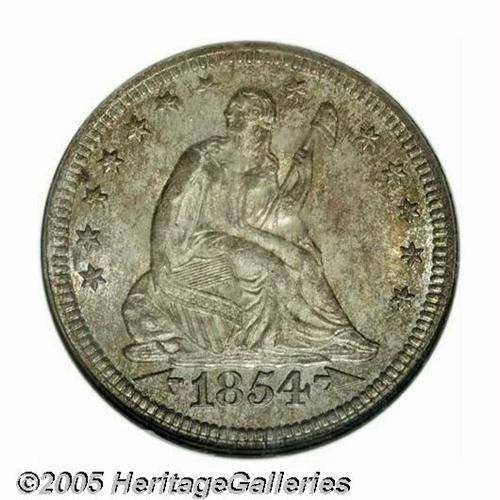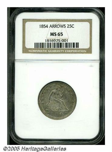 <B>1854<25C> Arrows MS65 NGC.</B></I> Even though the 1854-P has a sizeable original mintage, and is the most common issue of the 1854-1855 Arrows type, it is anything but common in the finer Mint State grades. The currently offered Gem is fully struck with original, mottled, gray-golden toning and no significant marks. One of the hallmarks of this piece is the exceptional luster. It is soft and frosted, lying under the toning in a relatively undisturbed state. The strike is also noteworthy, being full in all areas, and showing no softness on either side. A pleasing example of this popular two-year type.