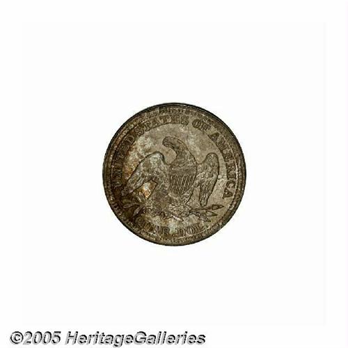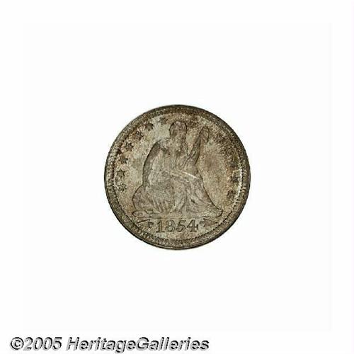 <B>1854<25C> Arrows MS65 NGC.</B></I> Even though the 1854-P has a sizeable original mintage, and is the most common issue of the 1854-1855 Arrows type, it is anything but common in the finer Mint State grades. The currently offered Gem is fully struck with original, mottled, gray-golden toning and no significant marks. One of the hallmarks of this piece is the exceptional luster. It is soft and frosted, lying under the toning in a relatively undisturbed state. The strike is also noteworthy, being full in all areas, and showing no softness on either side. A pleasing example of this popular two-year type which is quite difficult to find in full Gem grades.
