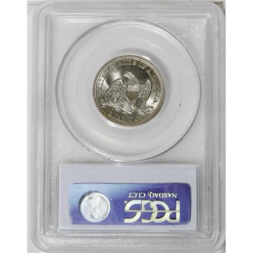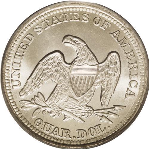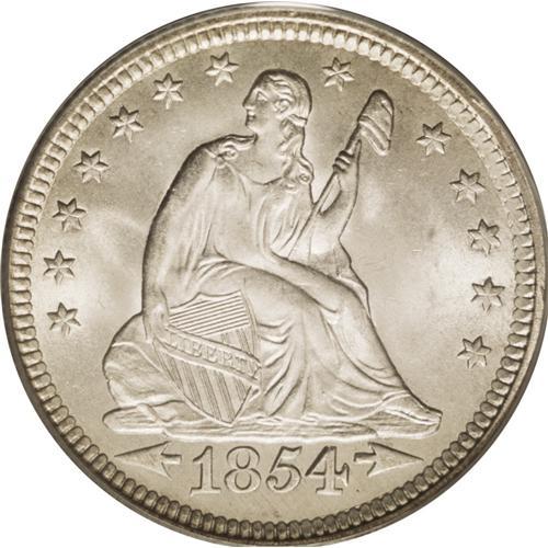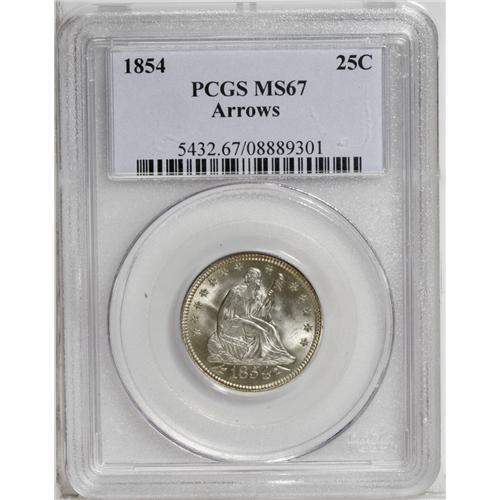 <B>1854<25C> Arrows MS67 PCGS.</B></I> Briggs 2-B? All obverse stars and arrows are lightly recut. There is a small tine of metal, appearing like a downward-pointing serif, at the left base of the 1 in the date. The ball of the 5 meets the vertical of that digit. While some of the characteristics of the Briggs (<I>Encyclopedia of Seated Liberty Quarters</B></I>) Reverse B are present--diagonal die polish lines noticeable through the last S in STATES, and a circular flaw where stripe 1 meets the horizontal stripes--this reverse also has characteristics not mentioned: The first two lines of stripe 1 both extend upward through all the horizontal stripes, and the bottom horizontal stripe extends leftward to pierce the shield border. Some faint old clash marks are seen on the reverse. This stunning, frosty specimen is completely untoned, with brilliant luster, and it is essentially unmarked and as struck, 152 years ago. A simply phenomenal and unimprovable piece. Population: 5 in 67, 0 finer (7/06).