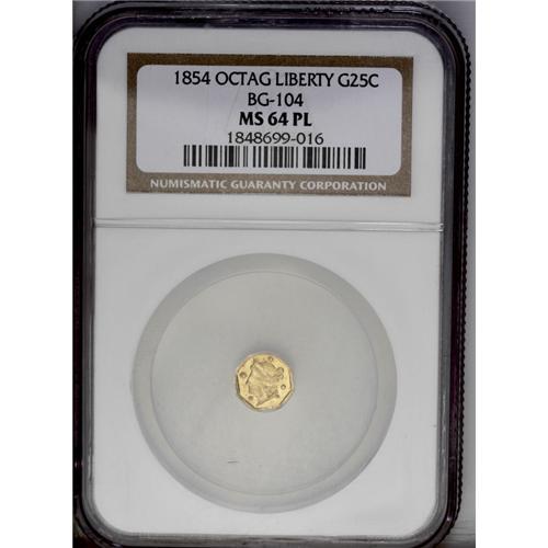 <B>1854<25C> Liberty Octagonal 25 Cents, BG-104, R.4, MS64 PL NGC.</B></I> A lovely yellow-gold near-Gem with heavy reflectivity and contrast. One of just two examples certified as Prooflike by NGC, and the higher-graded of the two (9/06).