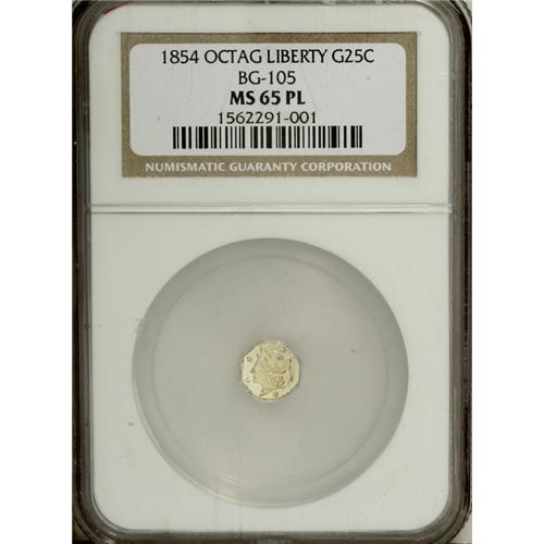 1854 25C Liberty Octagonal 25 Cents, BG-105, R.3, MS65