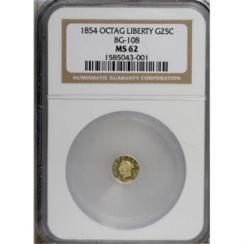<B>1854 25C Liberty Octagonal 25 Cents, BG-108, Low R.4, MS62 NGC.</B></I> NGC Census: (4/10). PCGS Population (40/47). (#10377)<BR><BR><b>Shipping:</b> Coins & Currency (<a target="_blank" href="http://www.heritageauctions.com/common/shipping.php">view shipping information</a>)