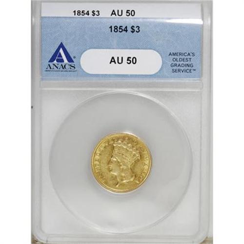 <B>1854 $3 AU50 ANACS.</B></I> NGC Census: (125/2509). PCGS Population (246/1605). Mintage: 138,600. Numismedia Wsl. Price for NGC/PCGS coin in AU50: $1,220. (#7969)<BR><BR><B>Coin Engraver:</B> James B. Longacre<BR><BR><b>Shipping:</b> Coins & Currency (<a target="_blank" href="http://www.heritageauctions.com/common/shipping.php">view shipping information</a>)
