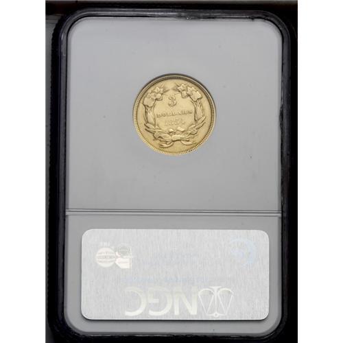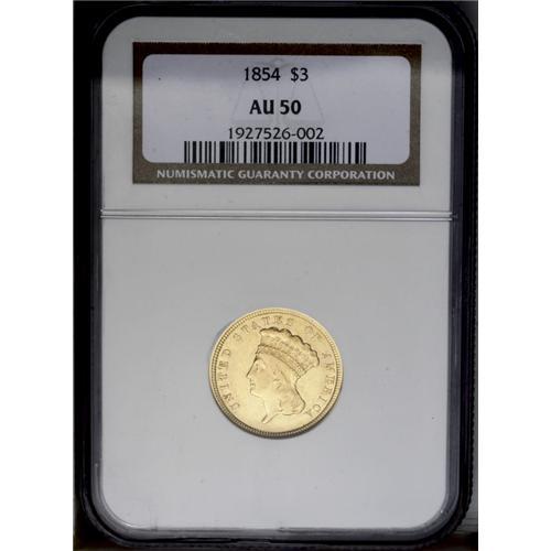 <B>1854<$3> AU50 NGC.</B></I> An original honey-gold specimen with green undertones, lightly worn with the loss of detail compounded by a weak strike. The surfaces have a few handling marks consistent with light circulation. An original and desirable piece.