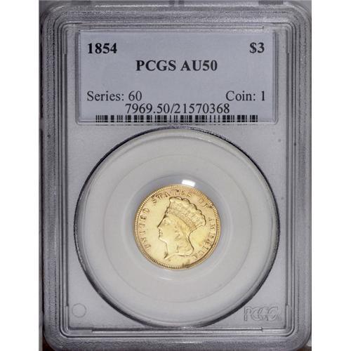 <B>1854<$3> AU50 PCGS.</B></I> A well struck example of this popular first year issue. A couple of noticeable marks are seen in the left obverse field, and several dark toning spots are noted on each side.