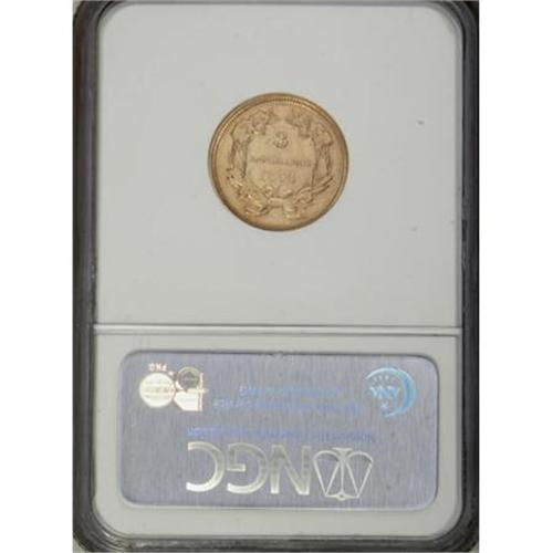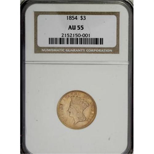 <B>1854 $3 AU55 NGC.</B></I> A lightly circulated, well struck example of this first-year odd-denomination issue, primarily yellow-orange with elements of deeper rose at the margins. The still-lustrous coin shows scattered abrasions on the portrait.<BR><BR><B>Coin Engraver:</B> James B. Longacre<BR><BR><b>Shipping:</b> Coins & Currency (<a target="_blank" href="http://www.heritageauctions.com/common/shipping.php">view shipping information</a>)