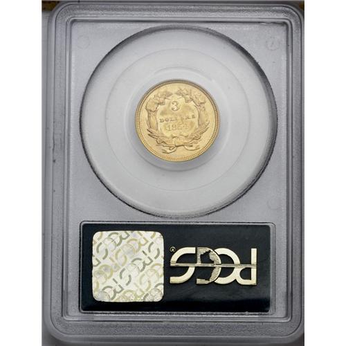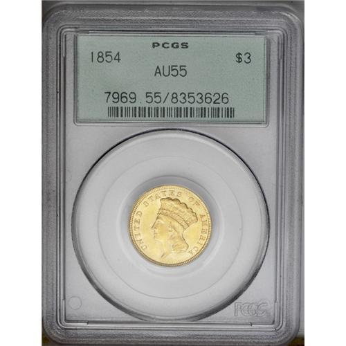 <B>1854<$3> AU55 PCGS.</B></I> This handsome and unblemished apricot-gold type coin possesses considerable luster, but the hair above the ear and beneath LIBERTY exhibits a trace of wear. Certified in an older green label holder.<BR><I>From The Royal Oak Collection.</B></I>