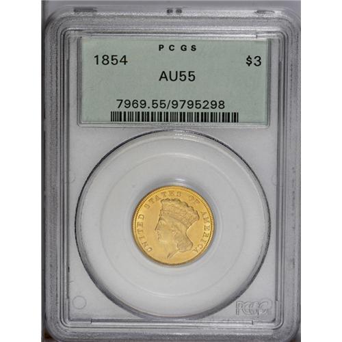 <B>1854<$3> AU55 PCGS.</B></I> Typically struck and quite lustrous despite a trace of highpoint wear. The orange-gold surfaces are generally clean, though an abrasion appears on Liberty's cheek.