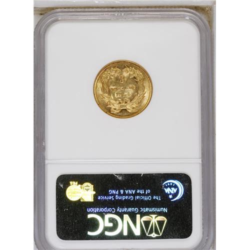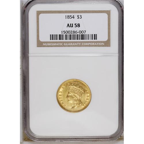 <B>1854 $3 AU58 NGC.</B></I> A hint of highpoint friction bars the way to a Mint State grade for this highly lustrous and appealing example. Suitably struck with still-lustrous yellow-gold surfaces.<BR><BR><b>Shipping:</b> Coin/Currency (<a target="_blank" href="http://www.heritageauctions.com/common/shipping.php">view shipping information</a>)
