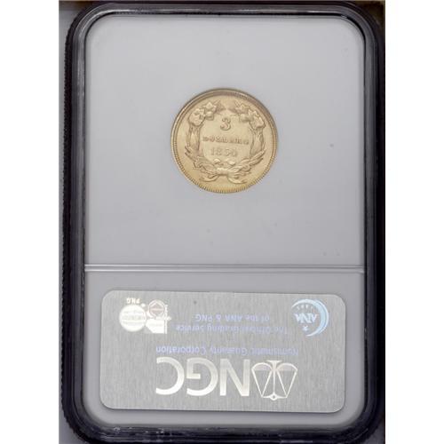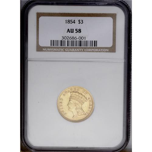 <B>1854<$3> AU58 NGC.</B></I> Always a popular issue because of its first year of type status, and the only year with the Small Letters reverse, the 1854 is also one of the more available issues in the series. This is a pleasing coin with light yellow-gold color, noticeable portions of luster clinging to the devices. Each side is virtually clear of distracting abrasions.
