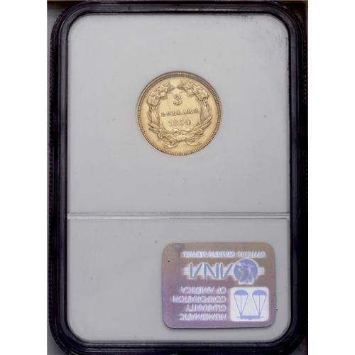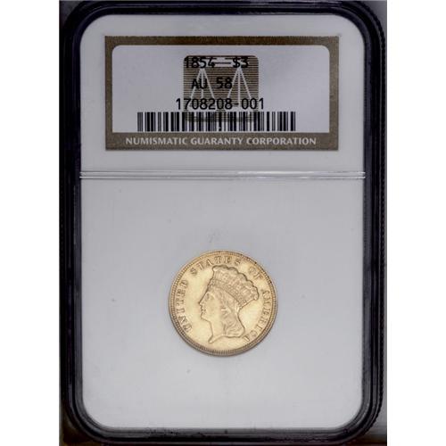 <B>1854<$3> AU58 NGC.</B></I> Beautiful straw-gold surfaces with just a hint of circulation wear. Considerable luster remains. A small pinscratch is noted to the left of the denomination, not overly distracting. Appealing!<BR><I>From The Steve Glenn Collection.</B></I> <BR><BR><B>Important notice:</B> Heritage usually auctions material at the rate of 200-250 lots per hour. On some occasions eBay Live bid software or the Internet may not be able to keep up with the pace of the auction. We recommend placing a realistic absentee bid now as insurance to avoid disappointment. Occasionally the auctioneer may eliminate or reject an eBay Live bid, and the auctioneer may also reopen a lot after the close of the eBay live bidding (usually because we missed an audience bid), and may reject your bid even if it shows you as the winning bidder. By bidding via eBay Live, you agree that Heritage may award the lot to another bidder at its sole discretion under the circumstances described above or any other reasonable circumstances. Since eBay bids are not shown to us until we open the lot on the floor, we treat those bids just like floor bids. In most cases the floor responds before the eBay bid is presented to us, due to Internet lag time, so for consistency we have made it a policy that floor bids are always considered first over tie eBay live bids. Also please note that all Heritage lots purchased through eBay Live carry a 20% Buyer's Premium. Please make sure you read the Terms and Conditions before you bid. This lot is being auctioned in conjunction with a live floor auction by Heritage Galleries & Auctioneers. All final auction and invoice information will be supplied by Heritage Galleries & Auctioneers, and all other information should be considered preliminary. Lot:2551 <BR><BR><B>Winning Notification and Billing:</B> After the FINAL session in this auction is complete, Heritage will send e-mail and snail mail invoices. This process normally takes several days. All final auction and invoice information will be supplied by Heritage Galleries & Auctioneers, and all other information should be considered preliminary. <BR><BR>This auction will be conducted on a live auction floor and over the Internet through eBay Live. If you choose to place an absentee bid, please take a moment to <font color='#0000ff'><u><a href='http://pages.ebay.com/liveauctions/help/before/laabsentee.html'>learn how eBay Live absentee bidding works</a></u></font><font color='#000000'>