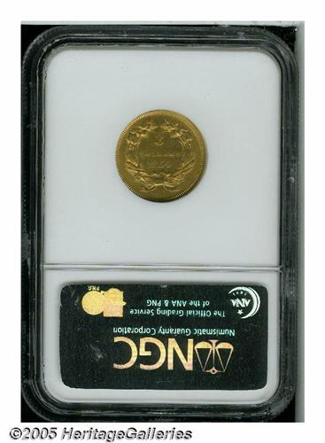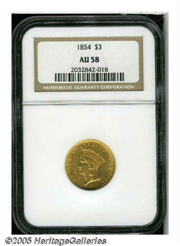 <B>1854<$3> AU58 NGC.</B></I> Fully lustrous with medium yellow-gold coloration. The fields are ever so slightly reflective. This is a wonderful example of the debut three-dollar piece.<BR><I>From the Dr. Kurt Peters Collection.</B></I> From the Dr. Kurt Peters Collection.