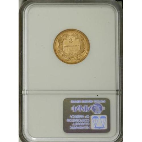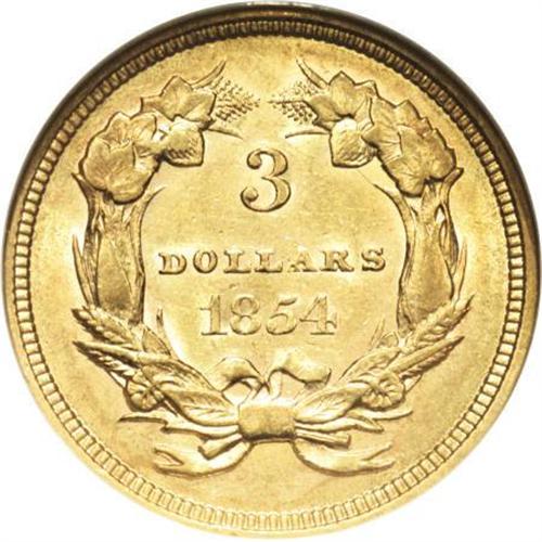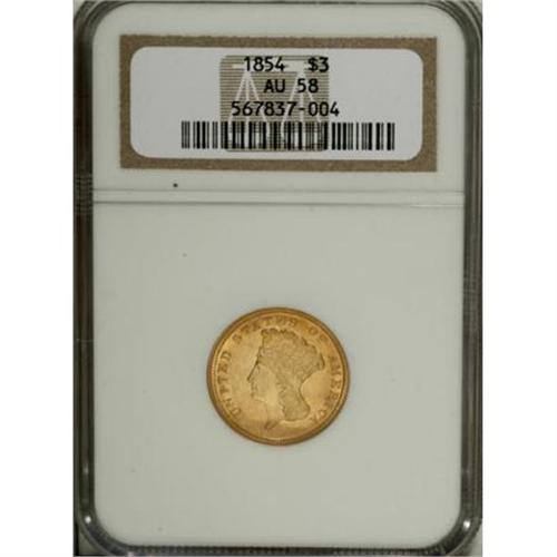 <B>1854 $3 AU58 NGC.</B></I> The first of the three dollar coins were struck in 1854, with a healthy mintage of 138,618 pieces. The high-end AU example in this lot possesses considerable luster. Its yellow-gold surfaces display hints of apricot, are minimally abraded, and exhibit nicely defined motifs.<BR><I>From The Casa Becca del Norté Collection.</B></I><BR><BR><B>Coin Engraver:</B> James B. Longacre<BR><BR><b>Shipping:</b> Coins & Currency (<a target="_blank" href="http://www.heritageauctions.com/common/shipping.php">view shipping information</a>)