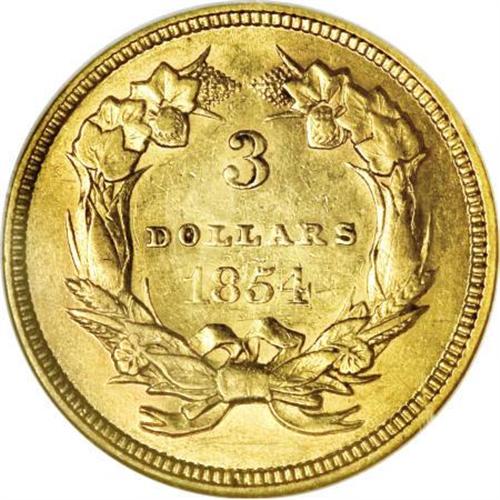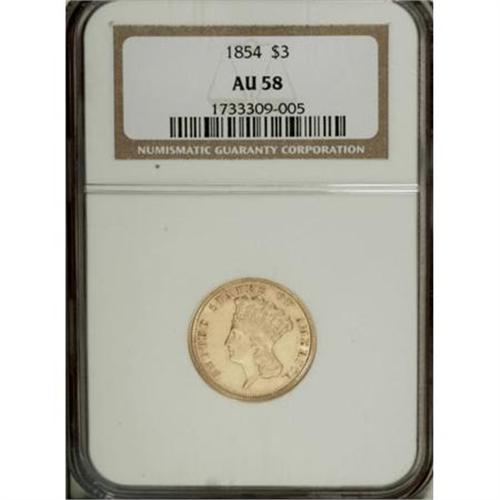 <B>1854 $3 AU58 NGC.</B></I> The 1854, 1874, and 1878 three dollar gold pieces are the type coins of the series, due to their large mintages within the context of this low-mintage set. The first-year 1854 is technically a one-year subtype, with small DOLLARS that was enlarged the following year. The present piece is an attractive yellow-gold example with no singular abrasions.<BR><BR><B>Coin Engraver:</B> James B. Longacre<BR><BR><b>Shipping:</b> Coins & Currency (<a target="_blank" href="http://www.heritageauctions.com/common/shipping.php">view shipping information</a>)