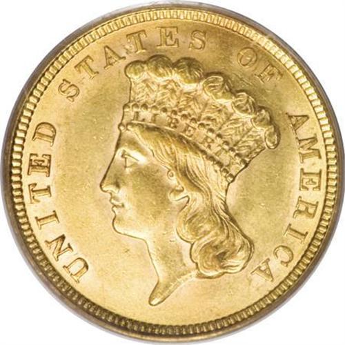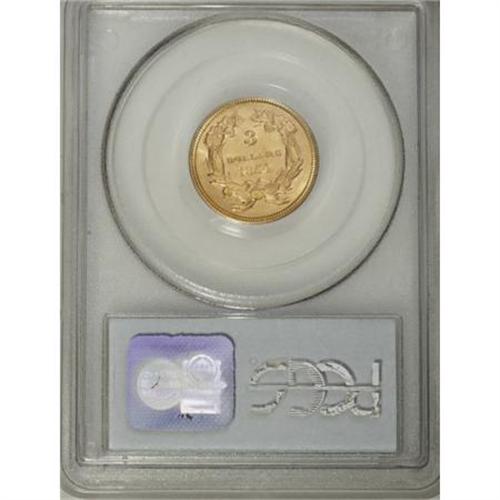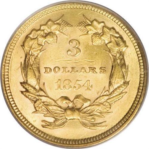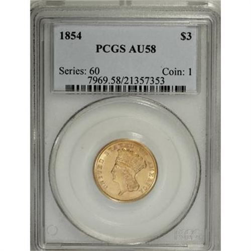 <B>1854 $3 AU58 PCGS.</B></I> This near-Mint three dollar possesses considerable luster on its brass-gold surfaces, and a solid strike results in strong definition on the design elements. The few minute marks located on the neck and in the central reverse field do not detract from the coin's overall appeal.<BR><BR><B>Coin Engraver:</B> James B. Longacre<BR><BR><b>Shipping:</b> Coins & Currency (<a target="_blank" href="http://www.heritageauctions.com/common/shipping.php">view shipping information</a>)