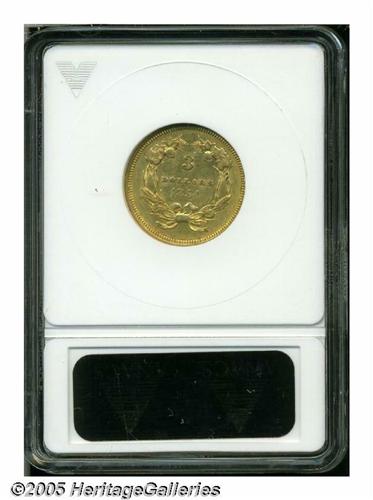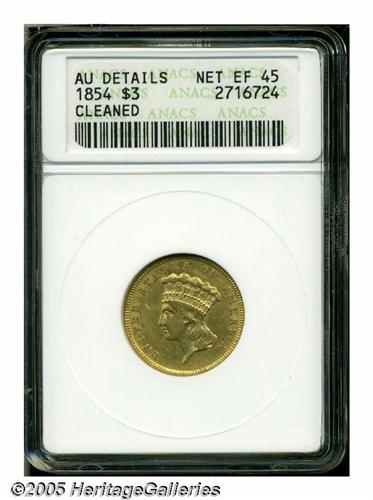 <B>1854<$3>--Cleaned--ANACS. AU Details, Net XF45.</B></I> A moderately hairlined type coin that nonetheless displays abundant bright luster throughout protected areas.