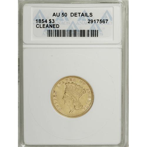 <B>1854 $3 --Cleaned--ANACS. AU50 Details.</B></I> A gently cleaned pale gold type coin that has no shortage of luminous luster within protected areas. A hair-thin lamination crosses the D in UNITED.<BR><BR><b>Shipping:</b> Coins & Currency (<a target="_blank" href="http://www.heritageauctions.com/common/shipping.php">view shipping information</a>)