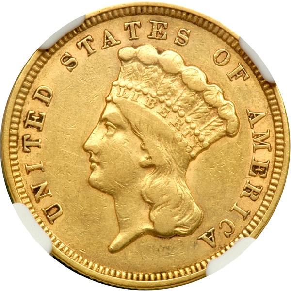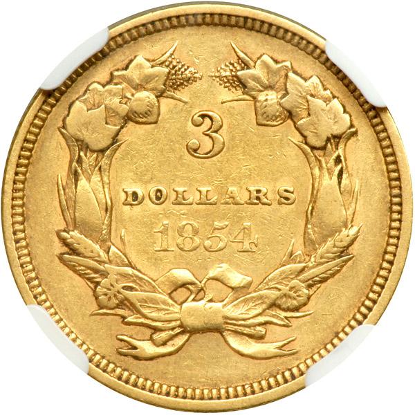 1854 $3 Gold. NGC graded Very Fine Details, improperly cleaned. Still a decent evenly worn example. First year of Type (PCGS # 7969) .