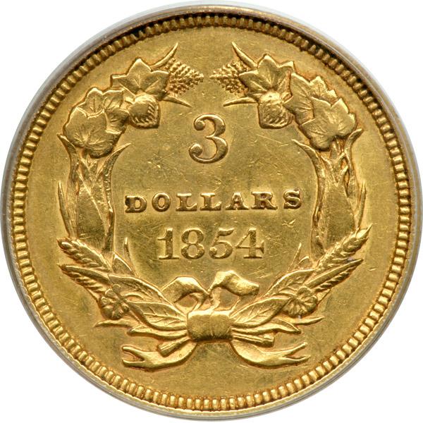 1854. PCGS Genuine. Our grade is Sharpness of AU-55 and lightly cleaned (PCGS # 7969) .