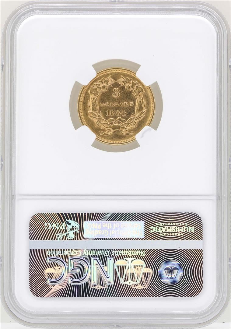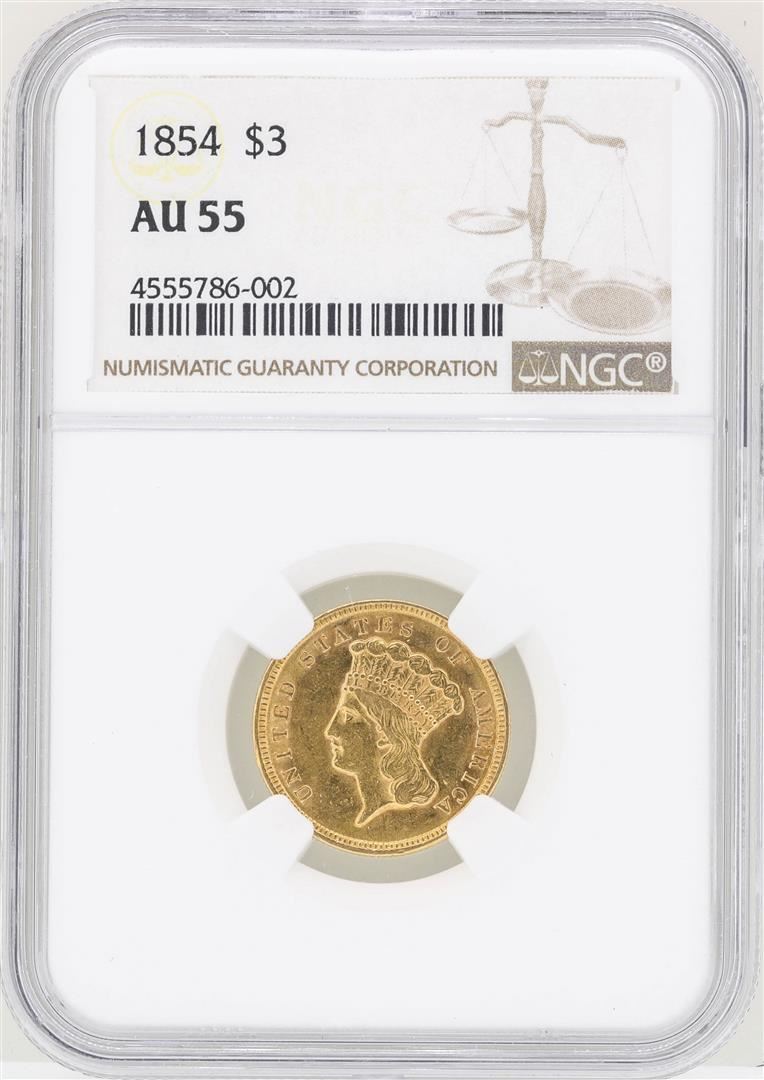 One 1854 $3 Indian Princess Head Gold Coin NGC AU55. NGC Certified.