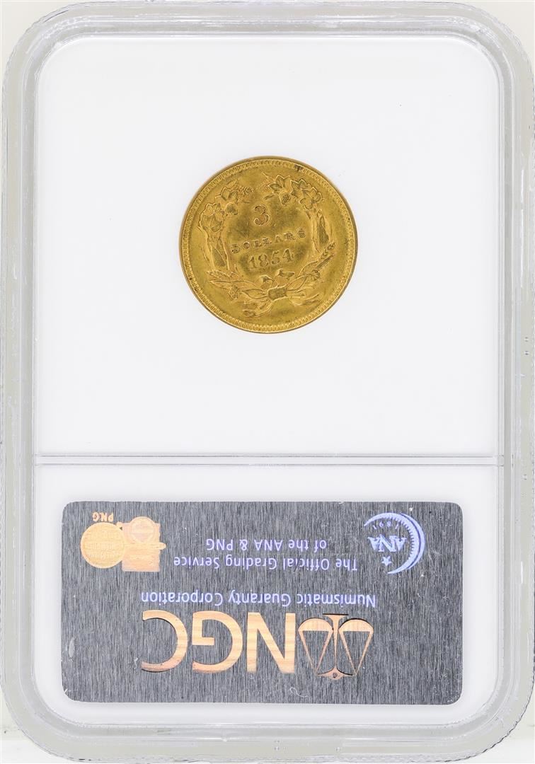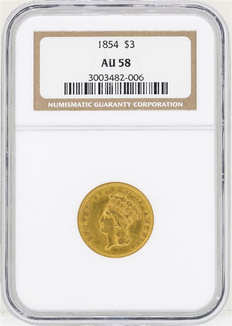 One 1854 $3 Indian Princess Head Gold Coin NGC AU58. NGC Certified.
