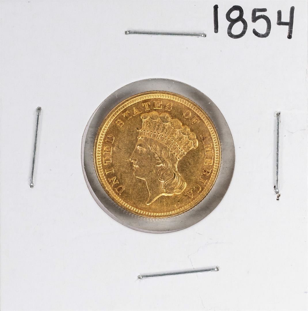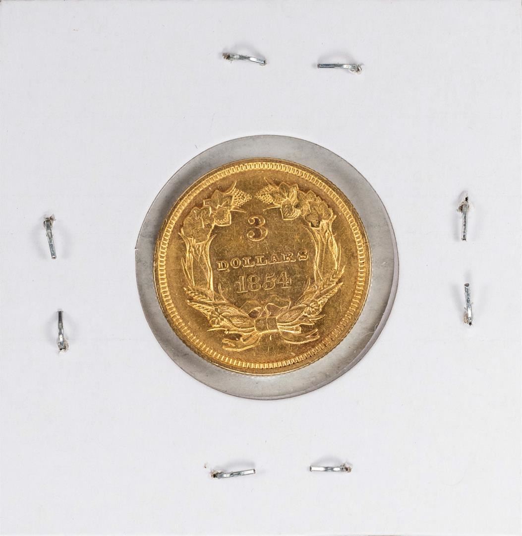 One 1854 $3 Indian Princess Head Gold Coin.
