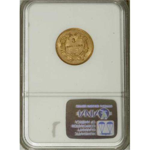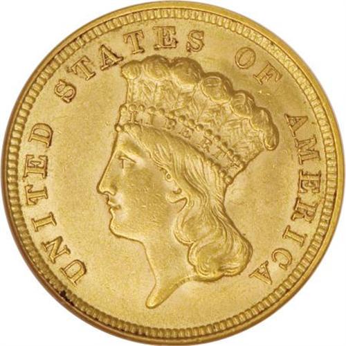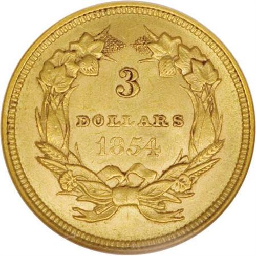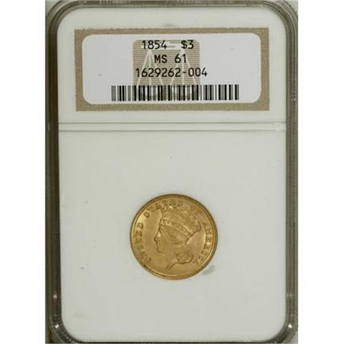 <B>1854 $3 MS61 NGC.</B></I> Although the 1854, 1874, and 1878 three dollar gold are the most widely collected for type purposes due to their relatively plentiful mintages, the 1854 is the most abundant of the three in terms of its original emission, at 138,618 business strikes plus a smattering of proofs. Today the 1854 is the second most abundant in Mint State, superseded by the 1878. The 1854 still edges out the 1878 in being one of the always-popular first-year issues of a new type, and it is technically a one-year subtype, with the Small Letters reverse. This piece displays deep, mellow orange-gold patina, with some claims to a finer grade in terms of good eye appeal and a relative absence of distracting abrasions.<BR><BR><b>Shipping:</b> Coins & Currency (<a target="_blank" href="http://www.heritageauctions.com/common/shipping.php">view shipping information</a>)