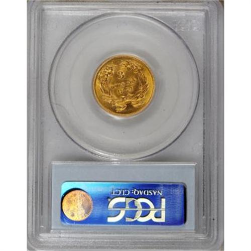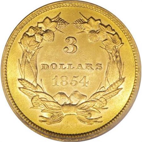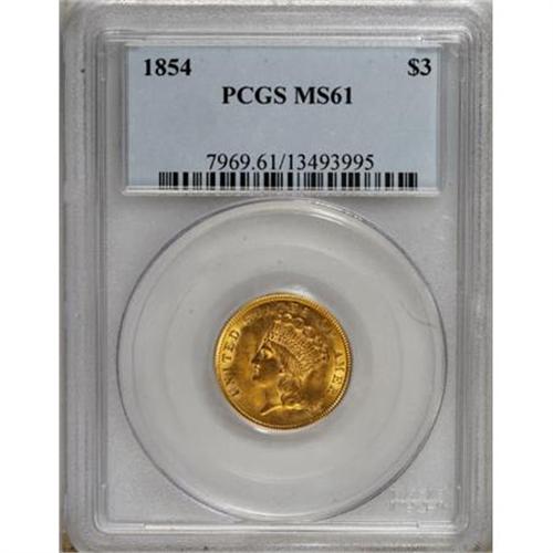 <B>1854 $3 MS61 PCGS.</B></I> This lustrous gold type coin has rich orange toning, and is clean for the grade aside from moderate contact on the left-side cotton leaves. The introductory 1854 is popular as a single-year type, since DOLLARS is in much larger letters on the 1855 and later dates.<BR><BR><B>Coin Engraver:</B> James B. Longacre<BR><BR><b>Shipping:</b> Coins & Currency (<a target="_blank" href="http://www.heritageauctions.com/common/shipping.php">view shipping information</a>)