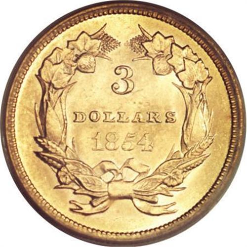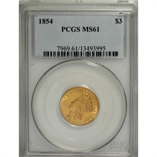 <B>1854 $3 MS61 PCGS.</B></I> This lustrous gold type coin has rich orange toning, and is clean for the grade aside from moderate contact on the left-side cotton leaves. The introductory 1854 is popular as a single-year type, since DOLLARS is in much larger letters on the 1855 and later dates.<BR><BR><B>Coin Engraver:</B> James B. Longacre<BR><BR><b>Shipping:</b> Coins & Currency (<a target="_blank" href="http://www.heritageauctions.com/common/shipping.php">view shipping information</a>)