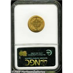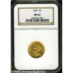 <B>1854 $3 MS62 NGC.</B></I> Always popular as the first year of issue, this nice Mint State example displays a few scattered abrasions that befit the grade but has lustrous surfaces that are satiny and give this piece above average eye appeal for the grade.