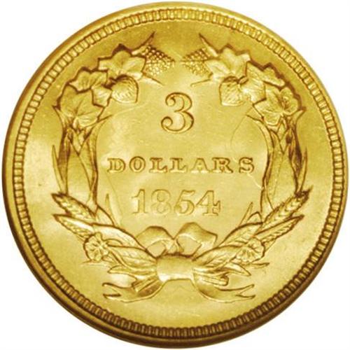 <B>1854<$3> MS62 NGC.</B></I> Exceptionally well struck for this first year three dollar issue, with a swirling, satiny glow and only a few unobtrusive surface marks. Pronounced die clashing is clearly visible on each side. Although the highest mintage issue in the series, surprisingly few Uncirculated representatives are consistently available.