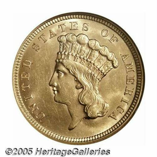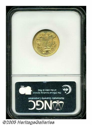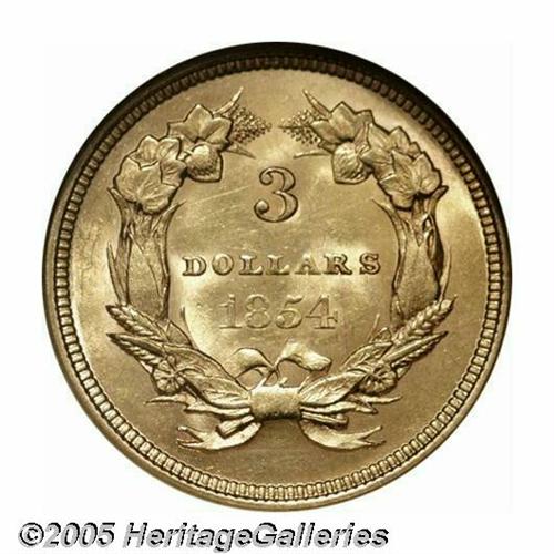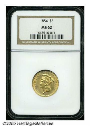 <B>1854<$3> MS62 NGC.</B></I> First year of issue for the denomination, and the only date with small letters in the word DOLLARS. This is a highly lustrous and attractive example with brilliant yellow-gold color and wisps of pinkish-gold toning. The surfaces have a few minor blemishes that limit the grade. An outstanding example, and affordable in terms of Mint State examples of this denomination.