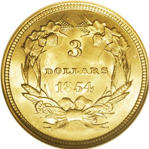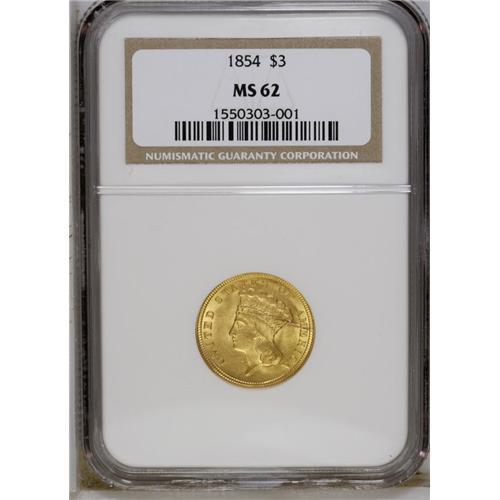 <B>1854 $3 MS62 NGC.</B></I> This is an exceptionally well executed three dollar piece, with excellent definition visible on the headdress, LIBERTY (except for minor softness in the I), and on the reverse wreath, letters, and numerals (though the 8 in the date is just a tad soft). Bright peach-gold surfaces reveal clash marks on both sides.<BR><BR><b>Shipping:</b> Coin/Currency (<a target="_blank" href="http://www.heritageauctions.com/common/shipping.php">view shipping information</a>)
