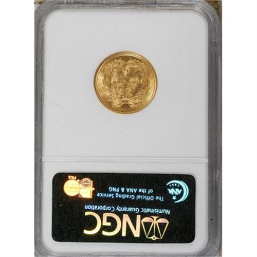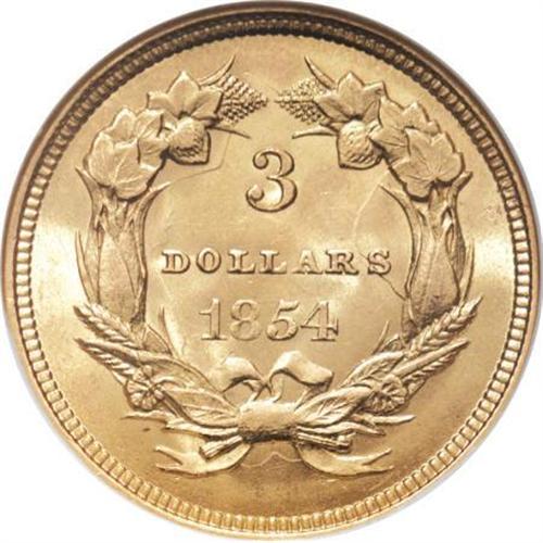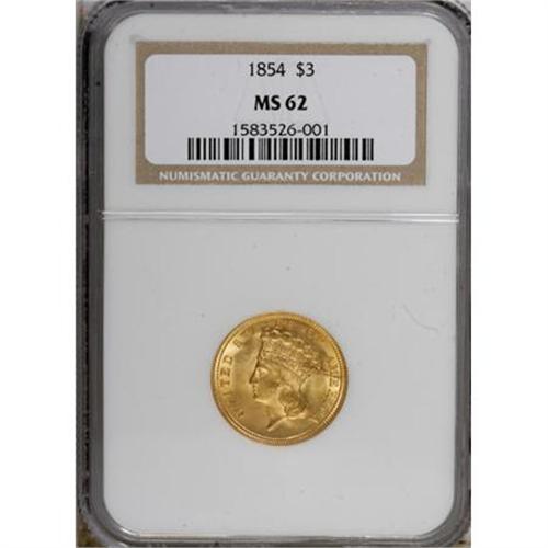 <B>1854 $3 MS62 NGC.</B></I> The first year of issue for the three dollar gold series. This MS62 specimen displays lustrous brassy-gold surfaces tinted with hints of light tan, and the design elements are well impressed throughout. Light grease streaks are visible in the right obverse, and both sides are clashmarked. A few wispy obverse marks are noted.<BR><BR><B>Coin Engraver:</B> James B. Longacre<BR><BR><b>Shipping:</b> Coins & Currency (<a target="_blank" href="http://www.heritageauctions.com/common/shipping.php">view shipping information</a>)