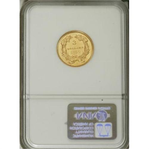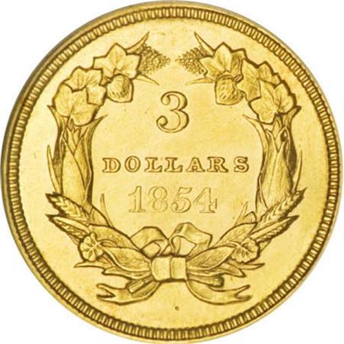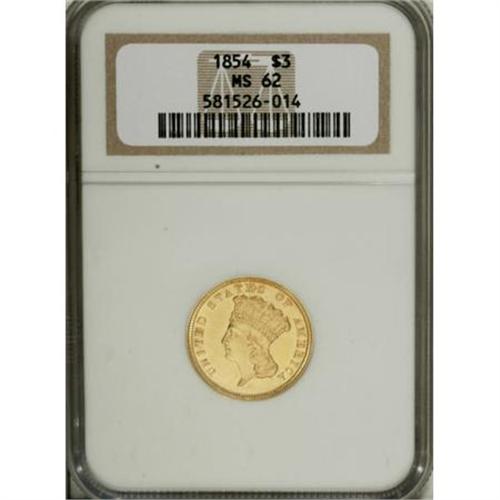 <B>1854 $3 MS62 NGC.</B></I> 1854 represents the first year of issue for the three dollar gold denomination and the production of 138,618 pieces marked the only instance in the issue where the annual mintage exceeded 100,000 coins. This example is sharply struck and features clean green-gold surfaces and rich luster. A few light hairline scratches are consistent with the grade. In high demand as a type issue.<BR><BR><B>Coin Engraver:</B> James B. Longacre<BR><BR><b>Shipping:</b> Coins & Currency (<a target="_blank" href="http://www.heritageauctions.com/common/shipping.php">view shipping information</a>)