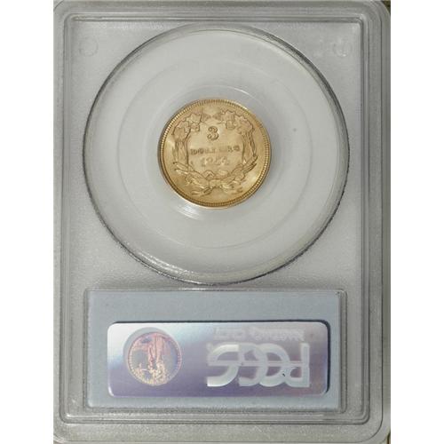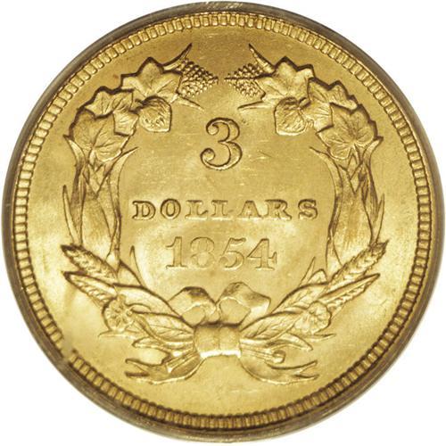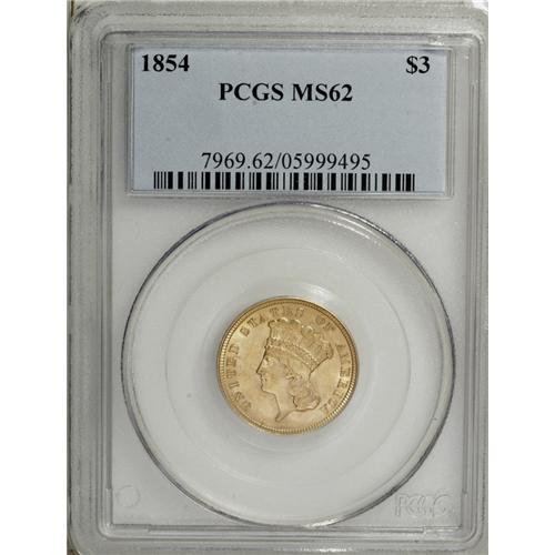 <B>1854 $3 MS62 PCGS.</B></I> The yellow-gold surfaces have fresh luster and occasional tints of lemon and lime in the fields. Its robust strike is most evident on the headdress, which clearly shows the veins at the tops of the feathers, a rarely-seen detail. Appealing overall, though luster grazes and light abrasions define the grade.<BR><BR><b>Shipping:</b> Coin/Currency (<a target="_blank" href="http://www.heritageauctions.com/common/shipping.php">view shipping information</a>)