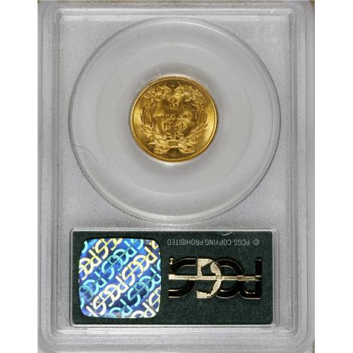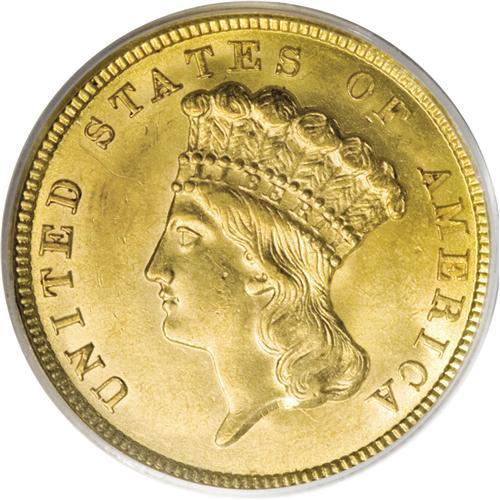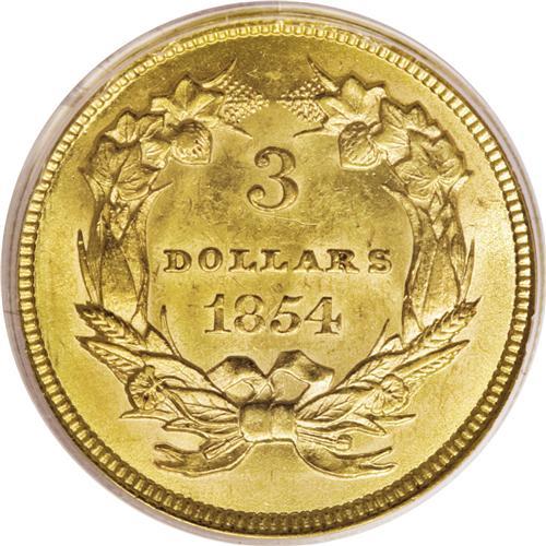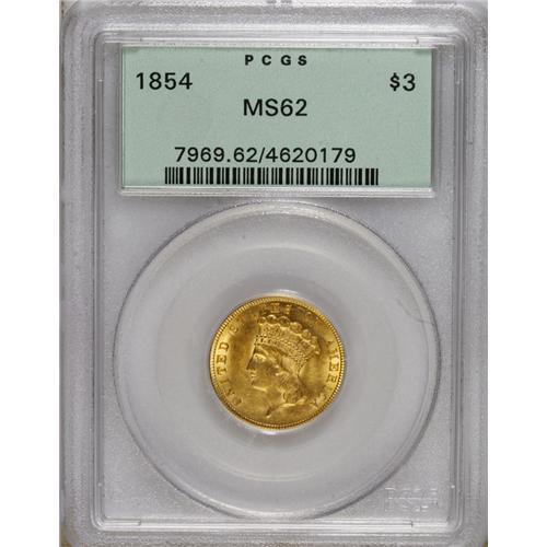 <B>1854 $3 MS62 PCGS.</B></I> This is the first year that three dollar gold pieces were issued, with a healthy mintage of 138,618 business strikes, the highest for the series. PCGS and NGC have certified a few thousand coins, most of which are in the About Uncirculated to Mint State 64 range. The current MS62 specimen displays pretty peach-gold color and well impressed motifs. The luster is nearly full, interrupted only in a few areas by fine hairlines. Quite a sharp coin overall.<BR><BR><b>Shipping:</b> Coins & Currency (<a target="_blank" href="http://www.heritageauctions.com/common/shipping.php">view shipping information</a>)