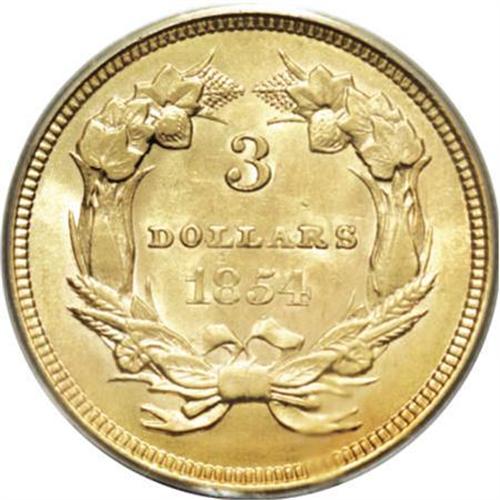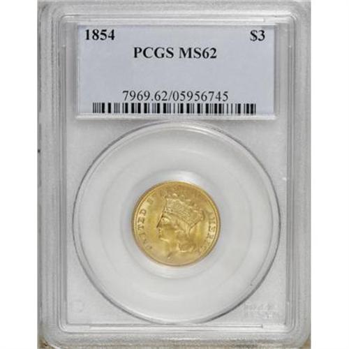 <B>1854 $3 MS62 PCGS.</B></I> This is a splendid Mint State example of the elusive three dollar gold coinage, with frosty surfaces and lovely honey-gold color on both sides. Nearly all aspects of the design are sharp. First year of issue for the denomination, with small reverse letters, the only such occurrence.<BR><BR><B>Coin Engraver:</B> James B. Longacre<BR><BR><b>Shipping:</b> Coins & Currency (<a target="_blank" href="http://www.heritageauctions.com/common/shipping.php">view shipping information</a>)