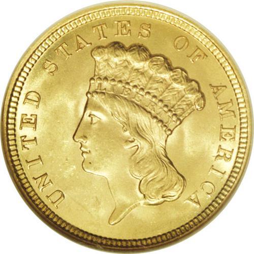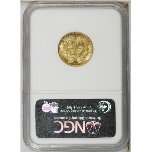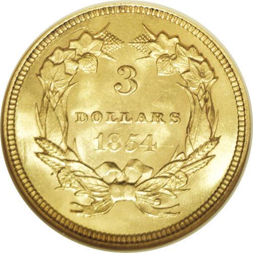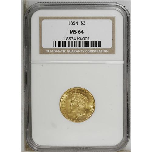 <B>1854 $3 MS64 NGC.</B></I> Sharply struck and fully lustrous with frosty yellow-gold surfaces. A faint field scratch over the left top of the wreath is the only blemish that keeps this piece out of the Gem grade classification. It is an exceptional example with a high degree of eye appeal. NGC has only certified 16 finer examples of this date (12/06).<BR><BR><b>Shipping:</b> Coin/Currency (<a target="_blank" href="http://www.heritageauctions.com/common/shipping.php">view shipping information</a>)