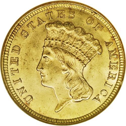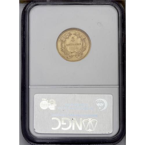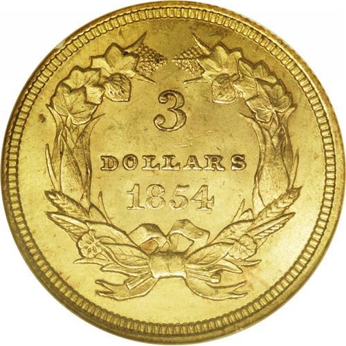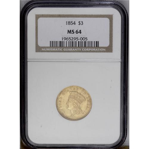 <B>1854 $3 MS64 NGC.</B></I> This denomination was authorized by the Act of February 21, 1853, the same Congressional legislation that reduced the weight of silver coinage. It was believed that a three-dollar gold coin would be convenient for postal transactions, especially for the purchase of 100-subject sheets of three-cent stamps. This issue marks the debut of the denomination, and it is technically a one-year type coin. The letters in DOLLARS are small and clearly shorter than the individual digits in the date. In all later years, these letters are taller, and approximately equal to the height of the date digits. Sharply struck and fully lustrous with rich yellow-gold coloration. A few flecks and splashes of coppery toning are visible on both sides. Census: 108 in 64, 18 finer (1/06).
