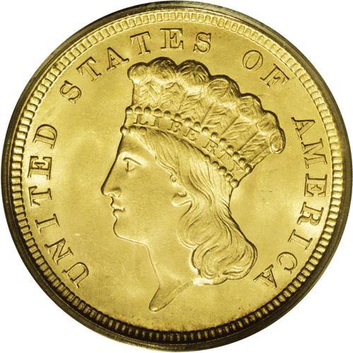 <B>1854<$3> MS64 PCGS.</B></I> Like the two cent piece and the twenty cent piece, the three dollar gold piece had its highest mintage figures in its first year; along with the 1874 and 1878, the 1854 is one of the most popular type issues of the series. The gold denomination seems to have had greater tenacity as well, as its 35-year production run encompassed both the bronze and silver coins' lifespans.<BR> The present example has orange-accented wheat-gold surfaces that sport fresh, original luster. The overall level of detail is excellent, though slight weakness, as usually seen, is noted on the hair above the ear. Though a few shallow abrasions on the obverse preclude Gem status, this piece has spectacular eye appeal.<BR><I>From The Troy Wiseman Collection.</B></I>