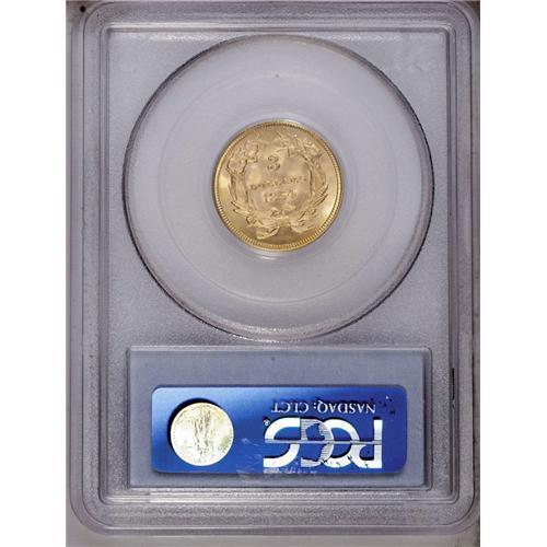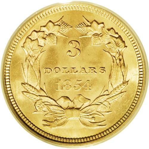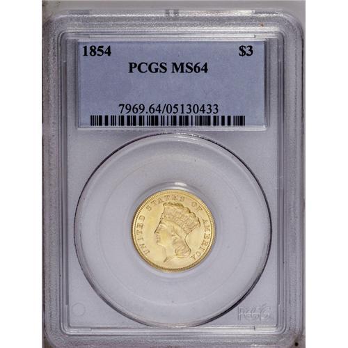 <B>1854<$3> MS64 PCGS.</B></I> The 1854 is important as the introductory three dollar issue, and is also noteworthy as a single-year subtype. DOLLARS is in small letters on the 1854-dated issues, while the 1855 and later dates all feature large letters in DOLLARS. The 1854 has the largest mintage of the series, but a relatively small portion was set aside at the time of issue, and the 1878, 1879, and 1888 are all more available in higher Mint State grades. The present precisely struck near-Gem offers full, coruscating mint luster, and has remarkable eye appeal. The fields and devices are refreshingly void of abrasions. Just 22 pieces are certified finer by PCGS (2/06).
