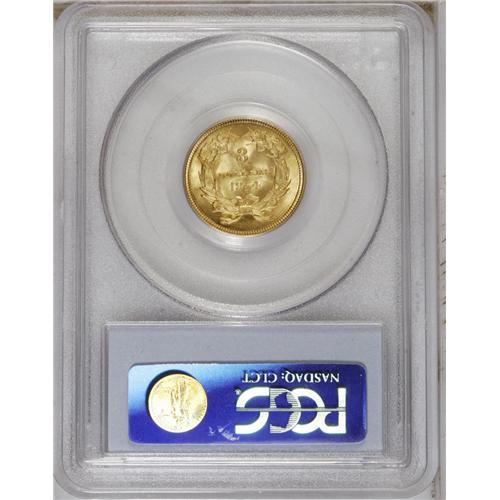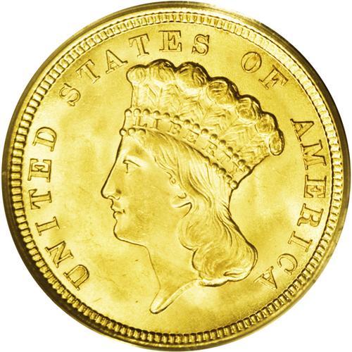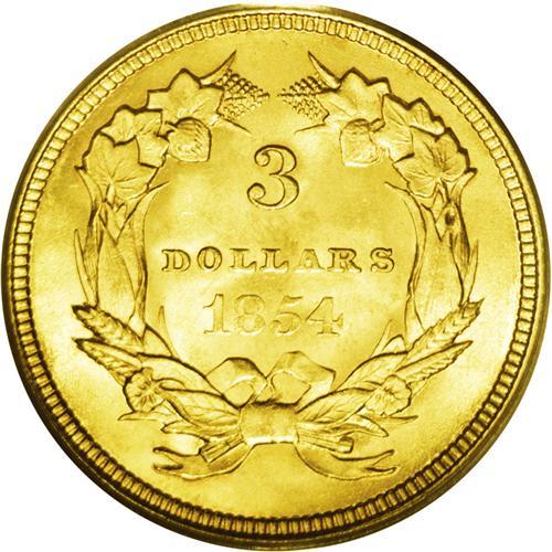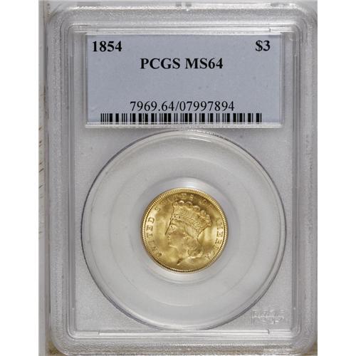 <B>1854<$3> MS64 PCGS.</B></I> This first-year of issue three dollar gold piece has the dual distinction of being a one-year design subtype, and also the highest mintage issue of the denomination. With a production of 138,000 coins, it is the only issue with a six figure mintage. On the reverse, the letters in DOLLARS are smaller than those used in subsequent years. This near-Gem example is a splendid piece. It has highly lustrous and fully brilliant yellow-gold surfaces with vibrant cartwheel luster. Only a few finer quality pieces have been certified, just 22 pieces by PCGS (9/06).