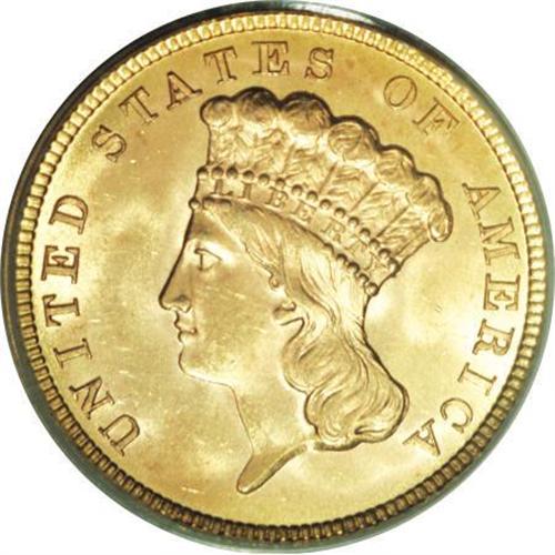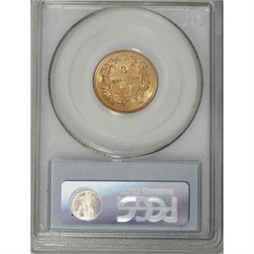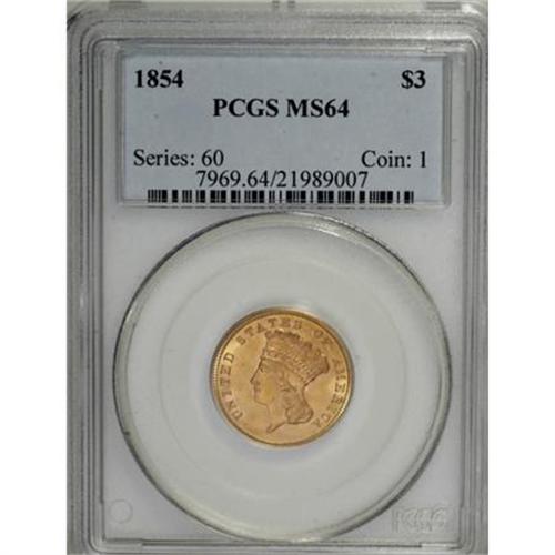 <B>1854 $3 MS64 PCGS.</B></I> While the 1854 issue is considered ideal for a type set, because of its relatively large mintage and first-year status within the series, few pieces have the generous eye appeal of the present piece. Deep reddish-gold patina graces each side, with wonderful luster emanating from the surfaces. The strike is boldly executed, even on the often-weak bowknot, and neither side reveals much in the way of ticks or abrasions, even under a loupe. The 1854 is lumped together with the 1874 and 1878 issues for "type" purposes, even though with the small ONE DOLLAR denomination it is technically a one-year subtype. Despite the "large" emission, PCGS has certified only 25 pieces in finer grades (1/08).<BR><BR><B>Coin Engraver:</B> James B. Longacre<BR><BR><b>Shipping:</b> Coins & Currency (<a target="_blank" href="http://www.heritageauctions.com/common/shipping.php">view shipping information</a>)