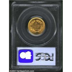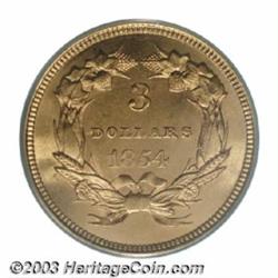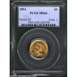 <TABLE cellSpacing=0 cellPadding=0 width="100%" bgColor=#000000 border=0><TBODY><TR><TD width="100%"><TABLE cellSpacing=1 cellPadding=3 width="100%" border=0><TBODY><TR><TD width="100%" bgColor=#79735c><FONT face=arial color=#ffffff size=3><B>Description</B> </FONT></TD></TR><TR><TD width="100%" bgColor=#ffffff><FONT face=arial size=2><B>1854 $3 MS64 PCGS.</B></I> A lustrous near-Gem with honey-gold color and beautifully preserved surfaces. Well struck aside from the 85 in the date. A faint luster graze on the upper left obverse field can only be seen under a lens and does not disturb the imposing eye appeal. The inaugural year of the denomination, the 1854 also had the highest denomination for the series. It is, however, many times scarcer in Uncirculated grades than the 1878. Interestingly, IB and ER in LIBERTY are much more widely spaced than the other letters, and this minor engraving mistake was never corrected through the end of the series in 1889. </FONT></TD></TR></TBODY></TABLE></TD></TR></TBODY></TABLE><BR><A name=PricesRealized></A><TABLE cellSpacing=0 cellPadding=0 width="100%" bgColor=#000000 border=0><TBODY><TR><TD width="100%"><TABLE cellSpacing=1 cellPadding=3 width="100%" border=0><TBODY><TR><TD width="100%" bgColor=#79735c><A name=PR><FONT face=arial color=#ffffff size=3><B>Previous Prices from Heritage Auctions</B> </FONT></A></TD></TR><TR><TD bgColor=#f6f6ed><TABLE cellSpacing=0 cellPadding=0 width="100%" border=1><TBODY><TR><TD align=middle width="33%"><B>Date</B></TD><TD align=middle width="33%"><B>Service</B></TD><TD align=middle width="33%"><B>Price</B></TD></TR><TR bgColor=whitesmoke><TD width="33%"><B>01/25/2000</B></TD><TD width="33%">PCGS</TD><TD width="33%">$5,500.00</TD></TR><TR bgColor=whitesmoke><TD width="33%"><B>10/15/2002</B></TD><TD width="33%">NGC</TD><TD width="33%">$5,060.00</TD></TR><TR bgColor=whitesmoke><TD width="33%"><B>01/08/1999</B></TD><TD width="33%">PCGS</TD><TD width="33%">$6,612.50</TD></TR><TR bgColor=whitesmoke><TD width="33%"><B>09/01/1993</B></TD><TD width="33%">PCGS</TD><TD width="33%">$7,150.00</TD></TR><TR bgColor=whitesmoke><TD width="33%"><B>01/01/1996</B></TD><TD width="33%">PCGS</TD><TD width="33%">$6,325.00</TD></TR><TR bgColor=whitesmoke><TD width="33%"><B>08/01/1995</B></TD><TD width="33%">NGC</TD><TD width="33%">$4,400.00</TD></TR></TBODY></TABLE></TD></TR><TR><TD bgColor=#ffffff><FONT face=arial size=1 ?>PLEASE NOTE: All prices realized reflect the final hammer price PLUS the buyer's premium in auctions that charge a buyer's premium. Each item has a notation at the top of the listing indicating whether that lot included a buyer's premium. Example: A item that sells with a final hammer price of $100 and a 20% buyer's premium will display with a price realized of $120. All information listed is intended to be as accurate as possible, but errors are possible. Please use this guide carefully and inform us of any inaccuracies. </FONT></TD></TR></TBODY></TABLE></TD></TR></TBODY></TABLE><BR><TABLE cellSpacing=0 cellPadding=0 width="100%" bgColor=#000000 border=0><TBODY><TR><TD width="100%"><TABLE cellSpacing=1 cellPadding=3 width="100%" border=0><TBODY><TR><TD width="100%" bgColor=#79735c colSpan=6><FONT face=arial color=#ffffff size=3><B>Price Guide*</B> </FONT></TD></TR><TR bgColor=#f6f6ed><TD align=middle><B>Grade</B> </TD><TD align=middle><B>Coin World<BR>(Trends)</B> </TD><TD align=middle><B>Numismedia<BR>Retail</B> </TD><TD align=middle><B>Numismedia<BR>Wholesale</B> </TD><TD align=middle><B>Coin<BR>Universe</B> </TD><TD align=middle><B>Heritage<BR>Value Index</B> </TD></TR><TR bgColor=#ffffff><TD align=middle>63</TD><TD align=right>$6,000.00</TD><TD align=right>---</TD><TD align=right>$4,200.00</TD><TD align=right>$5,400.00</TD><TD align=right>$4,094.38</TD></TR><TR style="FONT-WEIGHT: bold" bgColor=#cccfdd><TD align=middle>64</TD><TD align=right>$9,000.00</TD><TD align=right>---</TD><TD align=right>$5,150.00</TD><TD align=right>$6,150.00</TD><TD align=right>$5,216.25</TD></TR><TR bgColor=#ffffff><TD align=middle>65</TD><TD align=right>$18,000.00</TD><TD align=right>---</TD><TD align=right>$11,550.00</TD><TD align=right>$16,300.00</TD><TD align=right>$11,396.25</TD></TR><TR bgColor=#ffffff><TD colSpan=6><FONT size=1>*All information listed is intended to be as accurate as possible, but errors are possible. No item may be returned or refused based on this information which is provided as a service to our customers. You should contact each pricing source directly to determine the accuracy of this information. </FONT></TD></TR></TBODY></TABLE></TD></TR></TBODY></TABLE><BR><TABLE cellSpacing=0 cellPadding=0 width="100%" bgColor=#000000 border=0><TBODY><TR><TD width="100%"><TABLE cellSpacing=1 cellPadding=3 width="100%" border=0><TBODY><TR><TD width="100%" bgColor=#79735c><FONT face=arial color=#ffffff size=3><B>Population Guide</B> </FONT></TD></TR><TR bgColor=#ffffff><TD align=middle><!-- Begin Output of Population Grid--><TABLE cellSpacing=0 cellPadding=0 width="100%" border=0><TBODY><TR><TD vAlign=center><TABLE cellSpacing=0 width="100%" border=1 cellsadding="3"><TBODY><TR><TD vAlign=center><TABLE cellSpacing=0 cellPadding=3 width="100%" border=1><TBODY><TR><TD vAlign=center align=middle bgColor=#f0f1e8 colSpan=2 <CENTER><FONT face=Arial size=2><B>PCGS Pop </B></FONT><CENTER></CENTER></TD><TD vAlign=center align=middle bgColor=#f0f1e8 colSpan=2><CENTER><FONT face=Arial size=2><B>NGC Pop</B></CENTER></FONT></TD></TR><TR><TD vAlign=center><FONT face=Arial size=2>(64)</FONT> </TD><TD vAlign=center align=right><FONT face=Arial size=2>83</FONT> </TD><TD vAlign=center><FONT face=Arial size=2>(64)</FONT> </TD><TD vAlign=center align=right><FONT face=Arial size=2>62</FONT> </TD></TR><TR><TD vAlign=center><FONT face=Arial size=2>(>64)</FONT> </TD><TD vAlign=center align=right><FONT face=Arial size=2>19</FONT> </TD><TD vAlign=center><FONT face=Arial size=2>(>64)</FONT> </TD><TD vAlign=center align=right><FONT face=Arial size=2>12</F