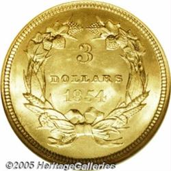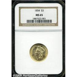 <B>1854 $3 MS65 NGC.</B></I> An extraordinary example of this underappreciated (at least in high grades) first year of issue, distinctive as the only year in which small letters were used on the reverse. The satiny honey-gold surfaces could hardly be more vibrant, in fact we have never seen an 1854 Three Dollar with vibrancy that exceeded this Gem, and the shimmering fields are essentially as struck. An exceptional piece and an ideal fit for the assigned grade. Population: 9 in 65, 5 finer (2/05).